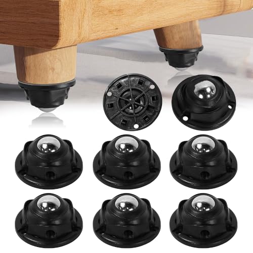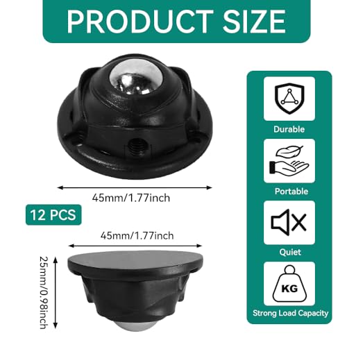 - 【Set of 12 Caster Wheels: 360° Smooth Gliding】This set provides 12 high-quality steel ball caster, each offering 360° free rotation and stable, smooth rolling. Once fitted, they allow you to move furniture like coffee tables and bookcases with ease. Say goodbye to the strain of heavy lifting when cleaning or rearranging, and significantly simplify your household tasks., 【Stainless Steel & ABS Construction: Each Caster Holds up to 28 lbs】The small caster wheels are crafted with a core of quality stainless steel balls and a robust ABS plastic housing. This combination provides excellent rust resistance, durability, and strength. With a load capacity of up to 28 lbs (approx. 12.7 kg) per caster, they offer a stable and reliable solution for moving heavier items., 【No-Drills Self-Adhesive Fix: Quick, Simple & Furniture-Friendly】Installation is incredibly straightforward, requiring no special tools or drilling. Simply peel off the backing film and press the caster firmly onto a clean, dry surface on your furniture base. This design protects your furniture from damage and lets you complete the upgrade in minutes for instant mobility., 【Quiet Roll & Floor-Safe: Peace of Mind Guaranteed】Designed with your flooring in mind, these self adhesive caster wheels smoothly and operate quietly. The soft-tread surface is gentle and won't scratch delicate floors like wood, tile, or stone. Move your furniture freely without worrying about marks or damage., 【Versatile Uses: The Ultimate DIY Home Helper】These casters are suitable for a wide range of household items. Whether it's furniture like bookcases, bedside tables, or side tables, or other objects like air purifiers, plant pots, storage boxes, or bins—adding casters gives them easy mobility. They are also perfect as DIY components, sparking your creativity to adapt practically anything in your home that needs to be moved.