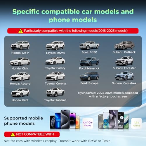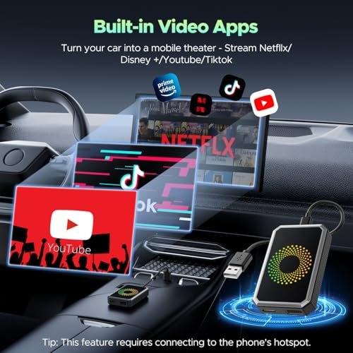 - Before You Buy: 1. Your car MUST have a factory wired CarPlay or Android Auto system. 2. Check your car settings to ensure "A-pple-CarPlay" is ENABLED before plugging in the box. 3. Use the included pin to switch the LED to BLUE if your car is an Android Auto-only system.4.Not compatible with BMW or Tesla Vehicles., Wireless CarPlay: Escape the shackles of cables and enjoy a truly liberating driving experience with this wireless CarPlay adapter. Easily project maps, music, and information onto your car's display using voice assistance—perfect for busy roads and long commutes. This newly upgraded A-pple CarPlay wireless adapter lets you keep your hands on the wheel and focus on the road., Built-in Video Apps:Turn waiting and travel time into entertainment moments with your CarPlay adapter. Stream Net-flix, YouTube, TikTok, Dis-ney+, or Prime Video directly on your car screen using your phone's hotspot. Ideal for keeping passengers entertained during traffic or on family trips — every ride becomes a joyride with your A-pple CarPlay adapter., Dual-Band WiFi:Never choose between smooth Wireless CarPlay and HD streaming. With 2.4G + 5G dual-band WiFi on your carplay wireless adapter, you can enjoy buffer-free movies while CarPlay stays stable. Great for road trips — passengers watch videos while you follow directions without a glitch., USB Drive Playback:Your entertainment, even when you're off the grid. Play movies and music directly from a USB drive — perfect for areas with poor signals or long journeys through the countryside. Share the experience powered by your A-pple CarPlay adapter with everyone in the car and enjoy non-stop fun., Quick Start:Get your wireless CarPlay adapter connected in seconds, not minutes. ① Switch car system to A-pple CarPlay. ② Plug the AI box into your USB port. ③ Pair your phone via Bluetooth/WiFi. It automatically reconnects on every drive — no repeated setup. Start smart, drive easy with your CarPlay adapter., Lamtto Dedicated Support: Drive with confidence, knowing this CarPlay wireless adapter is rigorously FCC-certified for safe, interference-free operation. We promise a response within 24 hours for your wireless CarPlay adapter, from installation to troubleshooting. You’re not just buying a product—you’re investing in a worry-free experience.