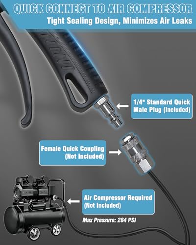 - 【STRONG AIRFLOW & EFFICIENT CLEANING】 – Powered by high-pressure air, the large-diameter venturi nozzle generates exceptionally powerful airflow, significantly amplifying cleaning force. the air hose nozzle provides high-volume, high-pressure air output, reaching a maximum of 284 PSI. The adjustable knob allows precise control of airflow, making the air compressor gun easy to tackle a variety of cleaning tasks with accuracy and efficiency., 【EASY TO USE】 – Designed for use with an air compressor, this air nozzle blow gun features a detachable 1/4" standard quick connect male plug and a maximum pressure of 284 PSI. For best results, pair it with a high capacity air compressor. Always use with caution – never aim compressed air at people., 【QUALITY ASSURED, ROBUST AND DURABLE】- Made from aerospace-grade nylon, this air blow gun is wear- and heat-resistant, built for frequent use. The compressor air gun’s handle has been tested for over 2,000,000 cycles, ensuring maximum strength and durability even in high-intensity workshops. Superior seals prevent air leaks, delivering reliable, long-lasting performance., 【ERGONOMIC DESIGN & PORTABLE HANGING HOOK】 – The air blower for compressor features an ergonomic, non-slip handle that provides a comfortable and secure grip during use, making this air gun compressor ideal for various cleaning tasks. The air blow gun for compressor’s built-in hanging hook allows for convenient storage and easy access when not in use., 【WIDE APPLICATION】 – This versatile air compressor blow gun is designed for a wide range of cleaning tasks. The air compressor blower nozzle is ideal for removing sawdust, wood chips, metal shavings, and debris from woodworking shops and industrial equipment, as well as for cleaning workbenches, tools, and hard-to-reach corners. It is also well suited for automotive cleaning and detailing, helping to blow away dust and debris during vehicle maintenance. Perfect for furniture gaps, window tracks, and other tight spaces around the home.
