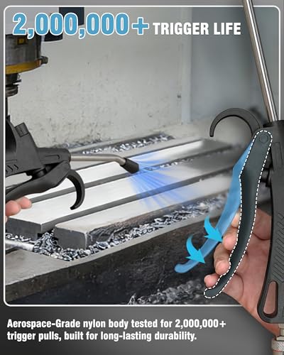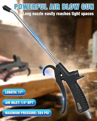 - 【STRONG AIRFLOW & EFFICIENT CLEANING】 - This air blow gun features an internal booster design paired with a focused nozzle, delivering a powerful, concentrated airflow. the air hose nozzle provides high-volume, high-pressure air output, reaching a maximum of 284 PSI. The adjustable knob allows precise control of airflow, making the air compressor gun easy to tackle a variety of cleaning tasks with accuracy and efficiency., 【EASY TO USE】 – Designed for use with an air compressor, this air nozzle blow gun features a detachable 1/4" standard quick connect male plug and a maximum pressure of 284 PSI. For best results, pair it with a high capacity air compressor. Always use with caution – never aim compressed air at people., 【QUALITY ASSURED, ROBUST AND DURABLE】 – The air nozzle for air compressor is made of high-strength stainless steel tubing, making it resistant to bending or breaking. The air compressor blow gun handle is wear- and heat-resistant, built for frequent use, and has been tested for over 2,000,000 cycles to ensure maximum strength and durability even in high-intensity workshops. Superior seals prevent air leaks, delivering reliable, long-lasting performance., 【LONG NOZZLE DESIGN】 –This air blow gun for compressor features a long nozzle that enhances flexibility, allowing this compressor air gun to easily reach narrow spaces and hard-to-reach corners. The ergonomic, non-slip handle provides a comfortable and secure grip during use, making this air gun compressor perfect for cleaning tasks. A hanging hook allows for convenient storage and easy access when not in use., 【WIDE APPLICATION】 – This versatile air compressor blower gun is designed for a wide range of cleaning tasks. The air compressor gun is ideal for removing sawdust, wood chips, metal shavings, and debris from woodworking shops and industrial equipment, as well as for cleaning workbenches, tools, and hard-to-reach corners. It is also well suited for automotive cleaning and detailing, helping to blow away dust and debris during vehicle maintenance. Perfect for furniture gaps, window tracks, and other tight spaces around the home.