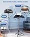 - 【Sturdy & Stable Support】Constructed with thickened aluminum for overall stability, the sturdy projector tripod features a 0.6-inch thick top tray and two elastic belts. Supporting up to 22 lbs in load capacity, the 16 x 11 inches tray is made of ultra-durable and environmentally friendly polymer material.It has four-sided border design and its surface has a frosted texture, preventing projectors, laptops, or other devices from slipping, scratching, or dropping., 【Adjustable Height】This tall laptop floor stand can be adjusted from 40 to 51.5 inches through the telescopic pole, and you can tilt the tray to reach the highest height 56 inch. With a press-to-lock buckle design, it can simply extend the telescopic pole and press the buckle to lock it in place.You can freely raise or lower the projector table to suit your viewing height when using a laptop, projector or tablet for movies., 【Flexible Tilt Angle】The projector stand features 45° tilt, providing a comfortable viewing angle, easily adjustable for projecting, working, or reading without device movement.From high-angle views to low ones, the projector tripod stand ensures that every presentation or movie is displayed perfectly, letting you find the perfect angle for your projection., 【Easy Installation & Usage】This projector tripod stand enables easy installation with a press-to-lock buckle design—simply tighten the lock buckle to secure tripod legs in seconds, no tools needed. Lightweight and foldable, it’s easy to store or transport for outdoor movies on the backyard, office presentations, or on-the-go use, ensuring quick setup anytime, anywhere., 【Multifunctional Scenes】The projector stand features a 16 x 11 inches tray (0.6 inches thick),the shelf for projector supports iPads, laptops, projectors, DJ turntables, books, sheet music, mixer and sound media devices. It is ideal for home theater, outdoor movies, office conferences, stage/studio performances, and DJ rack setups, making it a multifunctional equipment that meets versatile indoor and outdoor needs.