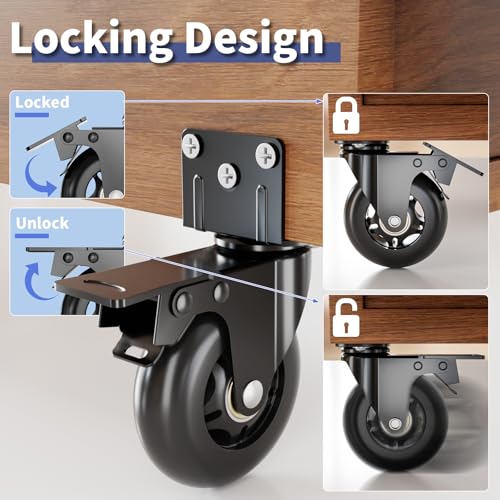 - HIGH QUALITY HEAVY DUTY CASTERS - These caster wheels are made of high strength industrial grade steel and high quality thermoplastic rubber material, the L-shaped top plate design shares the pressure borne by the rubber wheels and stabilizes the connection between the casters and the item, the casters set of 4 can support up to 1200 pounds and each chair wheels can hold up to 300 pounds, reducing fatigue from moving heavy items and avoiding the risk of injury., LOCKING BRAKE SYSTEM - The wheels for furniture have dual brakes that lock the bottom plate's rotational direction and the caster's forward direction at the same time, braking through foot action to hold heavy items in place and avoid potential hazards., 360° SWIVEL - The structure of double ball bearings drives the desk wheels to swivel 360°, the built-in precision ball and steel balls ensure smooth rotation and stable movement, easily realizing the movement of heavy items with minimal effort, saving your back and energy., QUIET AND NON-MARKING - The castor wheels are made of thermoplastic rubber, which has the elasticity of rubber and the plasticity of plastic, which can effectively cushion vibration and reduce friction, and will not produce excessive noise when used in indoor environments, and achieve non-marking gliding on all types of floors to protect them., WIDE APPLICATIONS - A set of heavy duty caster wheels includes 4 x 3 inch caster wheels, 20 screws and 1 screwdriver to facilitate easy mounting of the locking casters to carts, workbenches, furniture, shelves and other items, the castor's L shaped top plate design saves mounting space, and it can also be suitable for small DIY projects.
