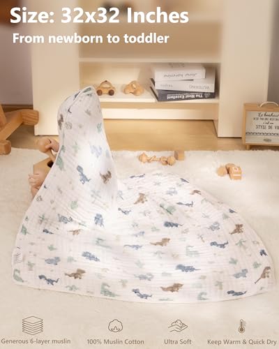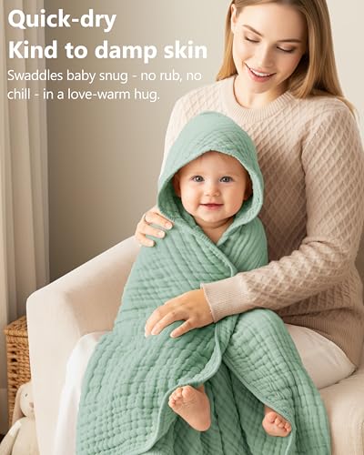 - Ultra Soft & Skin-friendly: Crafted from 100% high-count combed muslin cotton, these hooded baby towels are gentle enough on babies' delicate skin. With bubble-soft comfort and a cloud-light feel, our baby towels are designed for rash-free cheeks and bath time full of smiles., Super Absorbent & Quick-Dry: With 6-layer muslin (3x the absorbency of common cotton), our baby bath towels instantly wick moisture away to keep your baby warm, dry, and protected from chills. A just-right hood for a perfect wrap after bath — like a mother's cozy hug., Generous Size & Long Lasting : Measuring 32x32 inches, it's generously sized to swaddle your newborn and still comfortably wrap your toddler. Double-stitched reinforced edges ensure our bath towels stay intact and maintain their cloud-like softness and signature texture wash after wash. A lasting promise of quality and comfort., Multifunctional Essential: More than just a bath towel, they are versatile enough to be a baby blanket, a burp cloth, a baby beach towel or a stroller cover. Available in a variety of playful prints, they are the all-in-one helper every parent needs., Great Baby Gift: Welcome your little one with the first hug — our hooded baby towels are thoughtfully designed to swaddle baby in cloud-soft comfort, making them an ideal gift of love and practicality for baby showers and registries.