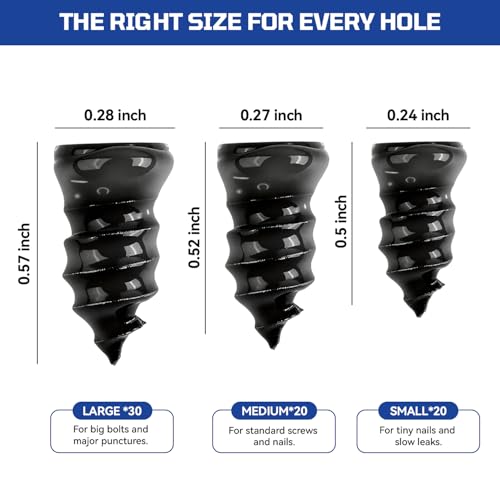 - COMPLETE & CONVENIENT KIT: This 72-piece tire repair set includes seventy durable rubber nails in three sizes (30 small, 20 medium, 20 large), one sturdy screwdriver, and a compact storage box; Everything you need for a quick and effective tire repair is organized in one portable case, DURABLE & RELIABLE REPAIR: Made from high-quality rubber material, these tire plugs resist aging and withstand high temperatures; They provide a strong, lasting seal that firmly embeds in the tire, preventing air loss and protecting the tire structure from internal moisture damage, QUICK & EASY APPLICATION: Repair a punctured tire in minutes without removing the wheel; The self-tapping design and included screwdriver allow you to insert the plugs effortlessly; Its user-friendly process makes it simple for anyone to achieve a professional-level repair on the go, THREE SIZES FOR PRECISE FIT: Our kit offers three different nail sizes to accurately match various puncture diameters; The small, medium, and large plugs ensure a tight seal for different hole sizes, providing a versatile solution for cars, motorcycles, trucks, and more, COMPACT & PORTABLE DESIGN: The included hard storage box keeps all components securely organized and protected from dust and damage; Its small size makes it easy to store in your car trunk, garage, or emergency kit, ensuring you are always prepared for unexpected flat tires