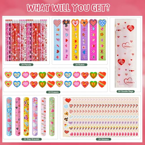 Valentines Day Party Favors 24 Pack Stationery Set Goodie Bag Class Gifts Classroom School Holiday Treat for Students Pencils Rulers Erasers Stickers slap