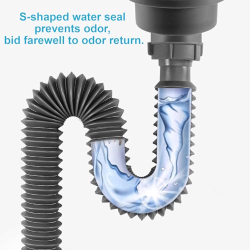 - 【Easy Installation, Leak-Proof Sealing】One-click secure connection! Our flexible sink drain hose features built-in compression washers at both ends, ensuring a watertight seal without the need for pipe tape. Simply screw it into a standard 1.5-inch drain opening—no leaks, no mess!, 【Superior Durable Materials】This flexible extension hose is made from thickened, high-temperature resistant, and corrosion-resistant polymers, making it resistant to cracking, tearing, and deformation. It endures even in extreme environments such as sink hot water drains and garbage disposals., 【Adjustable Length, Universal Size】Freely extendable and easily bendable! This corrugated drain hose is adjustable from 15in to 42.4in/58cm to 107cm and can bend 360° around obstacles. It fits universal 1.5-inch threaded drain openings—an ideal replacement for sink pipe replacement kits or flexible P-traps., 【Multi-Scenario Applications】One hose for all your drainage needs! It's perfectly compatible with kitchen sinks, bathroom vanities, bathtubs, laundry sinks, and dishwasher connections, offering versatility., 【Quick disassembly and maintenance, tool-free cleaning】Easy disassembly in 5 seconds for easy unclogging! The rotary connector allows for quick removal of hair, debris, or soap scum—no wrench required.