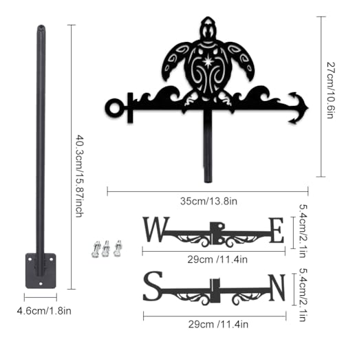 - Package Included -- Comes with 1 set of turtle-shaped weather vane with clear N/S/E/W markings, meeting both wind direction indication and outdoor decor needs., Perfect Size -- Measures 36cm/14" (length) × 67cm/26" (height), ensuring visibility and functionality in outdoor spaces., Sturdy Metal Build -- Made of black metal, it’s durable and suitable for long-term use in various outdoor conditions., Unique Turtle & Sea Design -- Features a turtle with wave and anchor elements, adding a coastal vibe to your outdoor area., Versatile Outdoor Use -- Ideal for roof, yard, farm, garden, and patio decor, serving as both a practical wind indicator and an ornamental piece.
