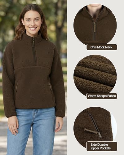 Baonmy Womens Half Zip Pullover Sherpa Fleece Sweatshirts Cropped Jacket Fuzzy Sweaters Fall Winter Jackets with Pockets (CA/US, Alpha, X-Large, Regular, Regular, Brown)