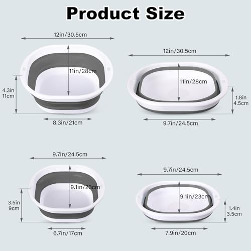 - Set includes: You will receive two folding basins in 5.6L(medium) and 2.8L(small). Dimensions when unfolded: Medium: 12 x 8.27 x 4.33 inches (30.5 x 21 x 11 cm) and the small basin measures 9.65 x 6.69 x 3.54 inches (24.5 x 17 x 9 cm) when unfolded., Portable Design: The unique foldable design ensures easy storage. When folded, the height dimensions for the medium and small sizes are 1.77 inches (4.5 cm), and 1.38 inches (3.5 cm), respectively. We have designed hanging holes for the folding basin, easy to hang., Excellent Quality: Foldable Washing Bowl, made of high quality PP+TPR material, which is durable, andenvironmentally friendly. The hard edges and bases make it more reliable for us to use. Thick and non-leakage, no peeling and colour fading., Multi-Purpose: This foldable bucket can be used to wash your face, hands, clothes, fruits and vegetables. A must-have product for your family, there's always a time to use it! Two models to meet daily needs, differentiated use of healthier., Widely Applications: The folding basin is a good choice for travelling, camping, barbecue picnics self-drive tour and other outdoor activities, in order to facilitate your take or moving, we designed a wider grip on both sides of the bowl area, very practical.