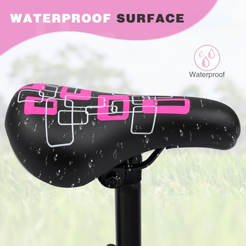 - Suts for : This Kids Seat suits for most 14 16 18 20 24 inch kids bike,MTB, BMX, Thick Cushion for Comfortable Rides: High-resilience foam layer absorbs shocks for kids comfortable riding, Beautiful Colors and Patterns: Black saddle with pink geometric pattern pattern, the combination of black and pink is more attractive and children will love it making., Excellent Waterproofing:Made from high-grade waterproof PU leather, this saddle won't soak up water or get damaged in the rain. Whether riding through puddles after a storm or on muddy trails, a simple wipe restores its like-new look. Less cleaning work for parents, more worry-free fun for kids, Easy to Install: Loosen the screws, insert the seat tube, and finally tighten the screws. There is an installation tool for your easy install