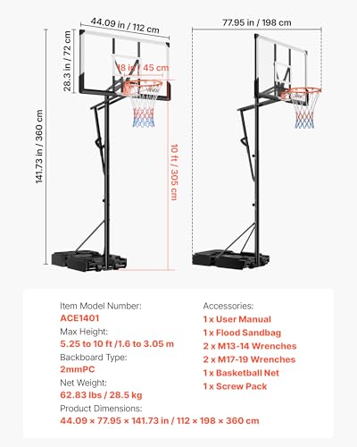 - Solid Structure: Our adjustable basketball goal system features a high-strength square steel frame with a PC backboard support structure, ensuring stability and impact resistance. The thick, fillable base keeps the hoop steady during intense play, making backyard basketball sessions reliable and engaging, Weather-Resistant Material: Featuring a 44 inch/1117.6mm PC backboard with 0.08 inch/2mm thickness and a PC frame, this kids adjustable basketball hoop ensures precise rebounds and clear visibility. The woven net holds up under outdoor play, enhancing accuracy and durability for consistent home or backyard basketball sessions, Flexible Setup: With easy-pull lift design, this basket ball hoop for outdoor allows height adjustments from 5.25 to 10 ft/1.6 to 3.05m. Effortless 3-second switching between indoor and outdoor settings supports players of every skill level for versatile and engaging play, Easy Rolling: Equipped with dual-brake swivel wheels, our outdoor basketball hoop offers 360° flexible rotation. Move it effortlessly to any location, then secure for steady play. Single-person operation allows quick setup for uninterrupted backyard or home basketball sessions, Enjoy the Basketball Game: This VEVOR basketball court comes with all installation tools for easy setup. Even beginners can assemble it quickly and start playing immediately. Ideal for family and friends to enjoy engaging basketball sessions and create lasting memories together
