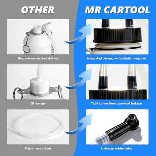 - [UNIVERSAL 1L BRAKE BLEEDER BOTTLE] Keep the motorcycle's braking system responsive and reliable under high-speed/high-load conditions. The MR CARTOOL Brake Bleeder Capture Bottle efficiently drains old brake fluid and refills new fluid in the braking system, effectively preventing and eliminating air bubbles and contaminants, ensuring optimal safety and longevity., [DESIGN OF ADJUSTABLE ROPE] The 66cm oil suction hose effectively prevents excessive tension caused by a rope that is too short, which could damage the seal between the vent bolt and the drain pipe, thereby avoiding external air being drawn into the brake line through gaps and the consequent reduction in braking force. The manual vacuum pump measures 40cm/18cm for easy operation., [DUAL FASTENING DESIGN] The brake fluid bleeder bottle features a built-in magnet for secure attachment to metal surfaces and can be easily double-fixed using the lanyard, effectively reducing leakage and enhancing the efficiency of brake bleeding operations., [BUILT-IN ONE-WAY CHECK VALVE] The brake fluid hose is equipped with a one-way check valve, allowing you to confidently perform solo brake bleeding with guaranteed zero backflow!, [VERSATILE & WIDELY COMPATIBLE] Whether you're servicing a motorcycle, an off-road ATV, or a family car, this brake bleeding kit is perfectly suitable, meeting diverse needs with just one tool.
