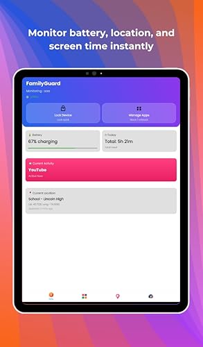 - Real-time location tracking for child safety, Monitor screen time and daily phone usage, View installed apps and block unwanted apps, Remote device lock for controlled phone access, Live dashboard showing current app and battery status, Detailed activity reports with charts and insights, Easy parent–child device pairing setup, Option to permanently delete all user data