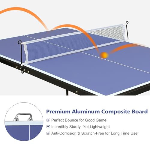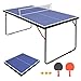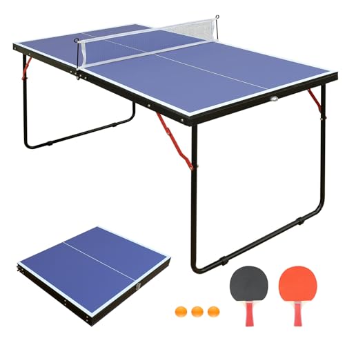 - 【Small Space Occupancy】Our table tennis table is a small size suitable for kids and teenagers, please pay attention! the unfolded size is 54 "x30 "x27"(L x W x H) /137.2x76.2x68.6 cm/4.5×2.5×2.2 ft, perfect for small living room and Carry for travel ; the folded size is 27 "x30 "x3.5"(L x W x H), you can easily store the folded table in a closet, behind a door or under the bed., 【Durable & Practical】Our outdoor table tennis table is made of MDF with a thickness of up to 12MM, which has excellent elasticity and non-slip properties, All-weather metal frame, not easy to rust. Perfect for your outdoor activities or indoor sports., 【Multifunctional Table & Gift】Our table tennis table is perfect for other recreational activities when you are not playing table tennis, such as using it for crafts, playing poker, etc., it is your ideal choice and the preferred ping pong table to enhance your relationship with your family and friends., 【100% Pre-assembled】Our ping pong tables are all 100% pre-assembled, the whole set includes a table, a pair of paddles, 3 ping pong balls and an all-weather nylon net. Once you receive the goods, just set up the net and start an intense and exciting table tennis game with your family and friends, it's so much fun!, 【After-Sales 】If you have any problem, you can contact the our support team at any time. We offer 24/7 professional customer support, will solve any problem in time and provide satisfying solutions if there are any problems!