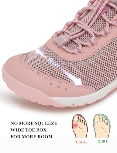 - [NATURAL BAREFOOT FEEL & WIDE TOE BOX] Experience the freedom of natural movement with our anatomically designed wide toe box. These minimalist shoes for women allow your toes to splay and flex naturally, providing a true barefoot feel while the zero-drop sole promotes proper posture and better balance during beach or trail walks., [QUICK-DRY & HYDROPHOBIC BREATHABILITY] Designed for water enthusiasts, our women's water shoes feature a high-tech hydrophobic mesh upper and a self-draining outsole. This quick-dry system ensures rapid water escape and maximum airflow, keeping your feet cool, dry, and light whether you are kayaking or swimming., [SAND-PROOF & DEBRIS PROTECTION] Say goodbye to uncomfortable sand and pebbles. Our barefoot water shoes women feature a specialized tight-weave lining that acts as a barrier against debris and small particles. These debris-proof swim shoes are perfect for rocky beaches and river explorations., [DURABLE GRIP & SECURE ADAPTIVE FIT] Engineered for safety on slippery surfaces, the ultra-grip perforated outsole (EVA + TPR) provides exceptional traction. Combined with a reinforced textured PU for abrasion resistance and an adaptive no-tie lacing system, these aqua shoes for women offer a secure, customized fit for all your adventures., [ULTRA-LIGHTWEIGHT & VERSATILE PERFORMANCE] Extremely flexible and lightweight, these minimalist water sneakers are designed to be packed easily for travel. From beach volleyball and paddleboarding to fishing and light hiking, they bridge the gap between performance gear and casual style. A summer vacation essential for active women.
