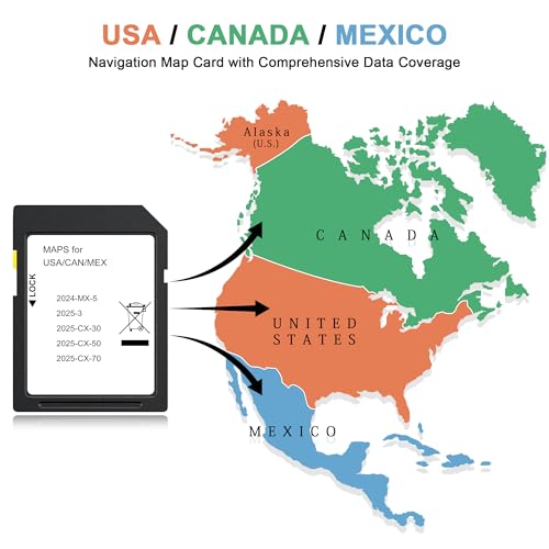 - 【Latest North American Map Update】Stay Navigated with the Latest North American Map Update. This essential update delivers the most current and comprehensive mapping data for the USA, Canada, and Mexico. Experience newly expanded coverage across hundreds of cities and counties, featuring updated roads, new points of interest (POIs), precise turn-by-turn directions, and intelligent lane guidance for smoother journeys., 【Wide Compatibility & Easy Setup】 Enjoy wide compatibility and an easy, plug-and-play setup that upgrades your in-car GPS in minutes—no technical skills needed. Just insert the card into your vehicle's designated slot for immediate activation. Confirmed compatible for 2024 Mazda MX-5, 2025 Mazda 3, 2025 Mazda CX-30, 2025 Mazda CX-50, 2025 Mazda CX-70, 【Always-On Offline Navigation】Never lose your way in remote areas, national parks, or cellular dead zones. This map card provides robust, full-featured offline navigation with pre-loaded maps, ensuring turn-by-turn guidance, POI search, and routing work perfectly without any internet or data connection., 【Quick & Easy Installation Guide】1: Power off your vehicle for at least 10 minutes. 2: In the center console, find the SD slot, remove the old card, and insert the new Map Card. 3: Turn the vehicle on; wait for the nav screen to confirm completion. 4: If not detected, reinsert the card or leave it in for a couple of hours to initialize. Please Note: One-Time Use & VIN Lock. This card is locked to the first vehicle's VIN it is installed in. It cannot be switched between cars., 【Buy with Confidence & Navigate with Precision】Simply plug in this navigation SD card to unlock the latest roads, neighborhoods, and points of interest across North America. Our comprehensive map data delivers accurate turn-by-turn guidance for every journey. Every purchase is protected by our full lifetime guarantee, ensuring your navigation stays current. We’re here to help with any questions.