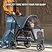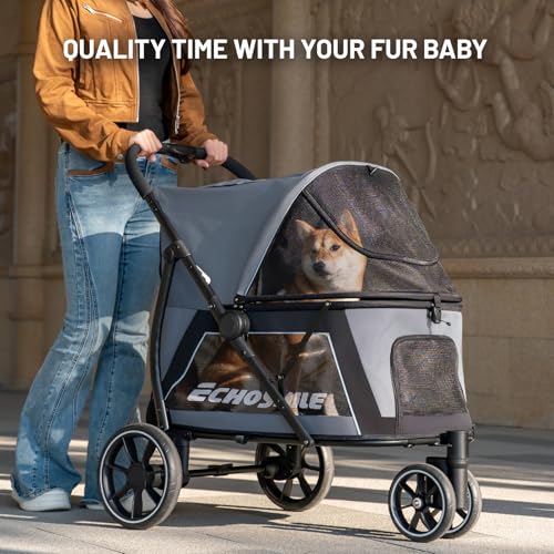 - 【All Terrain Mobility with Brakes】Featuring 10’’ solid rear wheels and 7’’ 360° swivel front wheels with shock absorption, this pet stroller glides smoothly over grass, gravel, pavement, and city streets. The agile 3-wheel design allows for tight turns, while the rear brakes provide extra safety and stability on your outdoor walks., 【One-Click Folding】Enjoy effortless portability with EchoSmile's one-click folding dog stroller, designed for quick, single-handed operation. Its compact folded size fits neatly in SUVs, car trunks, or garages for convenient storage. A built-in storage pocket keeps leashes, treats, toys, and personal essentials well-organized and within reach., 【Easy Access & All-Around Ventilation】The versatile doggy stroller comes with front and rear dual entries for barrier-free access, making it simple for senior dogs or puppies with joint issues to enter and exit. Multiple breathable mesh windows offer 360° ventilation to keep your pet cool year-round. The removable soft cushion adds extra comfort for long outings., 【Sturdy & Safe Construction】Built with durable 600D Oxford fabric and a reinforced carbon steel frame, this heavy-duty dog stroller is scratch-resistant and wear-resistant for long-lasting use. It includes an adjustable safety leash to prevent accidental escapes, plus reflective strips for improved visibility, ensuring maximum safety for your pet on every trip., 【Spacious for Medium Dogs】Engineered with a roomy interior :34" L x24" W x37" H, this EchoSmile pet stroller provides plenty of comfortable space for medium dogs. With an 80-pound weight capacity, it can hold up to three small or medium dogs or cats, ideal for trips to the park, mall, vet, travel and outdoor pet activities.