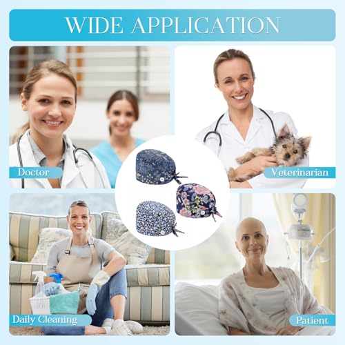 - BREATHABLE AND COMFORTABLE, ADJUSTABLE SIZE: This scrub caps women is made of high-quality cotton fabric, lightweight, soft, breathable, and skin-friendly, suitable for all-day wear. The back of the cap features an elastic band and double straps, allowing for free size adjustment to precisely fit different head circumferences., PRESSURE RELIEF AND EAR PROTECTION: The printed scrub cap features an upgraded double-sided button design, which can directly secure the mask ear loops, effectively preventing discomfort caused by prolonged pressure behind the ears, improving the work wearing experience., BUILT-IN SWEATBAND, DRY AND CLEAN: The scrub caps have a built-in 21.5cm x 5.5cm cotton sweatband at the forehead, which quickly absorbs forehead sweat, keeping the head dry and maintaining a neat hairstyle. No need for frequent manual wiping of sweat, suitable for long working hours., WIDE RANGE OF USES: This buttoned surgical caps for women can be used as a nurse's cap, doctor's surgical cap, medical head covering, and is also suitable for beauty spas, fitness activities, catering, and daily home protection. Beautiful and practical, it is an excellent gift for medical colleagues, relatives, and friends., GREAT VALUE SET WITH A VARIETY OF STYLES: The set includes 3 button-down scrub cap with clear and bright prints and a variety of styles to meet your daily changing and matching needs, easily matching various clothing styles and amplify your individuality.