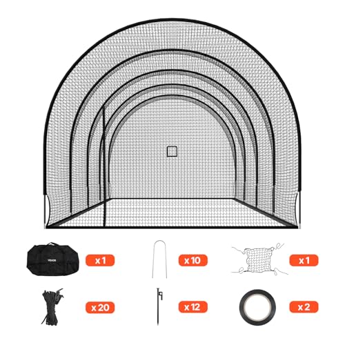 - Spacious Training Zone: Measuring 40.0 x 12.1 x 10.0 ft/12200 x 3700 x 3050mm, our batting cage net offers ample space for athletes, trainers, and coaches to practice efficiently. The fully enclosed design keeps balls contained, ideal for both indoor and outdoor training in baseball or softball sessions, Reinforced Netting: Crafted with polyester netting and 4-ply reinforced mesh, this batting cage withstands repeated impacts. The thick 600D nylon edge fabric with reinforced corners keeps the net intact, allowing athletes to practice hitting and pitching while improving technique efficiently, Durable Fiberglass Poles: Featuring high-heat cured fiberglass rods and reinforced joints, this hitting cage maintains stability during strong winds or intense practice. To extend lifespan, avoid leaving it outdoors for long periods and store it carefully after each session, User-Friendly Design: This VEVOR softball baseball cage features a removable cage door and pitching machine opening for convenient training. One end has a large zippered entry, while the other allows pitches from outside the cage, helping athletes of all ages improve swing accuracy and hitting power efficiently, Quick Setup: With just two people, this baseball & softball hitting cage netting can be assembled easily. Its simple design and complete accessories allow one-step setup, and the included storage bag ensures easy transport to indoor or outdoor practice locations