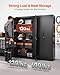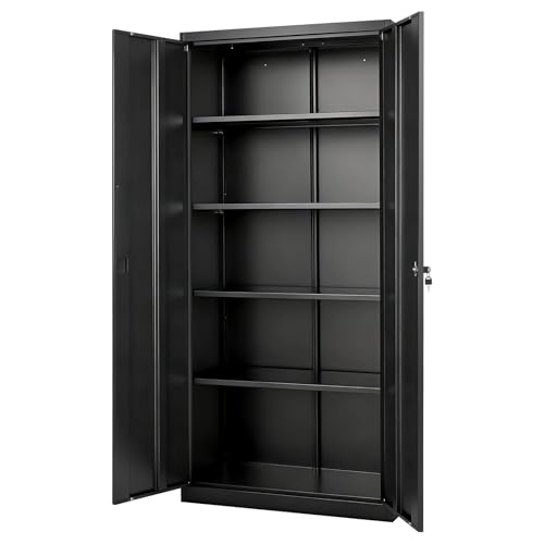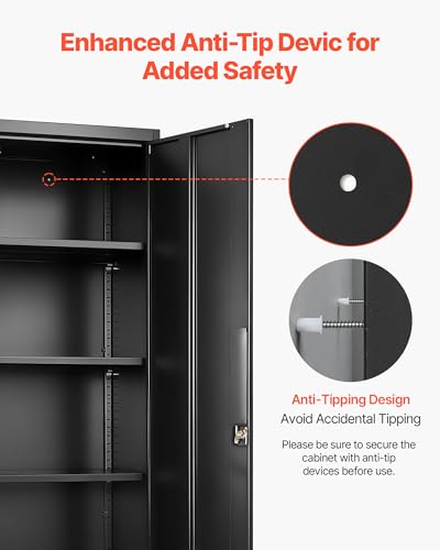 - Maximize Storage Space: This metal cabinet features 5 spacious layers, with 4 adjustable and removable shelves that easily fit items of various heights. Its flexible design makes it ideal for organizing office files, garage tools, or household supplies, Sturdy and Durable: Built from heavy-duty steel, this metal garage cabinet features a rust-, corrosion-, and scratch-resistant finish. Each shelf supports up to 120 lbs/54.4 kg, with a total capacity of 600 lbs/272.1 kg, ideal for storing office file, garage tool, Secure and Stable: A three-point lock with 2 keys keeps your items secure in this garage storage cabinet. 4 magnetic catches hold doors tightly closed, while reinforced triangular supports prevent tipping, Wall-Mountable Safety: The back of this steel storage cabinet includes mounting holes for secure wall installation. Always install the anti-tip kit before use, especially around children or on uneven surfaces, to provide extra stability, Easy Assembly: Featuring a simple panel design, this lockable metal locker allows quick, easy setup. Step-by-step instructions guide you to assemble it fast and start organizing your storage space immediately