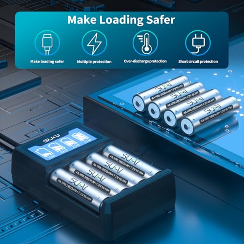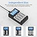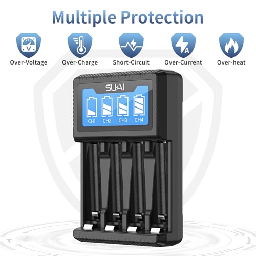 - 【Individual Slots】 aa aaa battery charger has 4 Individual charging slots and supports mixed charging mode, which fits AA, AAA NI-MH batteries., 【Intelligent LCD Screen 】rechargebale battery charger has an intelligent LCD screen that can monitor battery charge level and detect faulty batteries., 【 LED indicator 】smart battery charger has an intelligent LED screen. Red light - charging, Green light - full charged, 【Multiple Safety Protections】 aa rechargeable battery charger has the function of preventing overcharging, overcurrent, overvoltage, overheating, and short circuits., 【Packaging】: 1 *4 Bay LCD Battery Charger, 1 * Cable, 1 * Instruction Manual.
