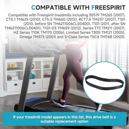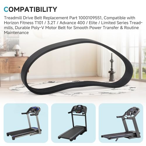- [Compatibility] Treadmill Drive Belt Replacement Part 1000109551, Compatible with Horizon Fitness T101 / 3.2T / Advance 400 / Elite / Limited Series Treadmills, Durable Poly-V Motor Belt for Smooth Power Transfer & Routine Maintenance, [Durable Rubber] Constructed with wear-resistant rubber and an internal fiber cord tension member, this treadmill motor drive belt offers good tensile strength and dimensional stability. Suitable for home and commercial treadmill maintenance, [Quiet, Low-Slip Operation] Ribbed design keeps the belt in the pulley grooves, reducing squeaks, vibration, and speed fluctuations. Ideal replacement if your treadmill slips or makes rubber noises during use, [Compatible with Advanced & Vision] Compatible with Advanced Fitness Group treadmills including 3.5AT TM659B (2015), Advance 400 TM75 (2003), Advance 400 TM75C 30132 (2004), Advance 400 PTM110 301321 (2003), Club Series CST3.5 TM160 (2006), Elite Series 2.3T TM230 (2007), Elite Series 3.0T TM103 (2004) and Elite Series 3.2T TM145 (2006). Also compatible with Tempo Fitness 632T TM667 (2012) and Vision Fitness T8200 treadmills from 1998–2000 (gray, folding, TM10 / TM29), [Compatible with Freespirit] Compatible with Freespirit treadmills including 30519 TM265 (2007), CT5.1 TM625 (2010), CT5.3 TM660 (2012), RCT7.6 TM237 (2007), T101 (2010, before SN TM6211006CL00400), T101 (2011, after SN TM6211006CL00401), T101-03 TM659 (2012), Series T73 TM211 (2007), HZ Series T10K TM170 (2006), Limited Series T805 TM121 (2005), Omega TM373 (2001) and S-Class Series TSC4 TM76B (2003). If your treadmill model appears in this list, this drive belt is a suitable replacement option