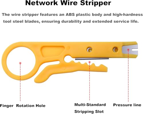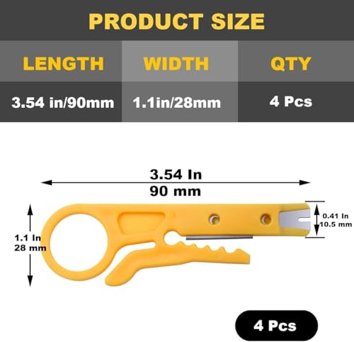 - COMPLETE 4-PACK SET: Includes four mini wire strippers providing excellent value for professional electricians, network installers, or DIY enthusiasts who need multiple tools on hand, MULTI-FUNCTION DESIGN: Combines wire stripping, crimping, and punch down cutting capabilities in one compact tool for efficient cable preparation and termination work, NETWORK CABLE COMPATIBLE: Specifically designed for RJ45, Cat5, and Cat-6 network cables, as well as telephone and computer UTP cables for versatile connectivity projects, PORTABLE AND COMPACT: Mini-sized design allows for easy storage in tool belts, pockets, or toolboxes, making it convenient to carry to different job sites or work areas, PRECISION CUTTING: Features sharp cutting edges and precise stripping mechanisms to cleanly remove cable insulation without damaging internal wires, ensuring reliable connections