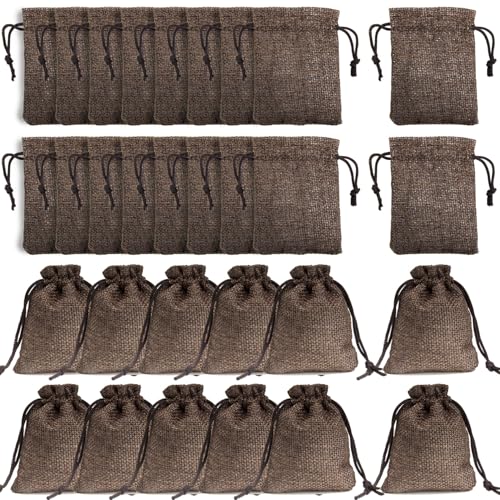 SevenFish 50pcs Burlap Bags with Drawstring, 9x7cm Small Burlap Bag Rustic Burlap Sack Gift Bags for Wedding, Birthday, Christmas, Present, Jewelry Packing, Party Gift and DIY Craft, Dark Coffee
