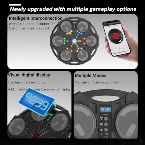 - Friendly Design for Fun Exercise: This wall-mounted musical punching target offers a fun way to exercise. Its compact size and wall-mounted design make it ideal for homes or gyms, providing a convenient and space-saving solution for staying active and entertained, Visual Score Display and Bluetooth Music for Enhanced Experience: The built-in visual score display adds excitement, while Bluetooth connectivity allows playback of custom music, enhancing children’s workout experience. This feature makes the exercise more engaging and enjoyable, motivating kids to stay active and have fun while working out, Light Effects for Engaging Workouts: The boxing machine features light-up effects to enhance engagement and motivation, encouraging children to keep punching along and enjoy their workout. The dynamic lighting adds an extra layer of excitement, making the exercise more interactive and visually stimulating, Three Stimulating Modes for Diverse Training: Choose from Challenge Mode, Freeplay Mode, and Memory Mode to diversify training and increase difficulty, keeping children enthusiastic about their workout routine. These modes offer a variety of challenges and goals, ensuring that the exercise remains interesting and rewarding, Durable Construction for Long-Lasting Use: Crafted from premium materials, this machine is built to last with low noise levels, ensuring long-term enjoyment without disturbing others. Its sturdy construction and quiet operation make it a practical and reliable addition to any home gym or workout space