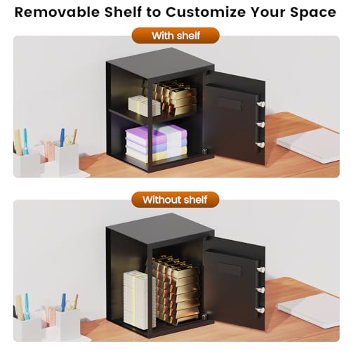 - 【STURDY & PRY-PROOF HOME SECURITY SAFE BOX】The document safe is made of solid cold rolled steel integrally welded with recessed pry-resistant door, and comes with 3 enhanced steel locking bolts, durable steel construction to keep your property safe. Scratch and stain resistant powder coating protects the safe from rust and damage., 【DIGITAL SECURITY SAFE WITH COMBINATION LOCK】This Large Digial Home Security Safe is designed with numeric keypad and spare keys. The protruding sloped design of the keyboard is more ergonomic than a flat keyboard and protects your cervical spine. Programmable code can set your own code to open the safe box quickly. You can also use the key to open the safe. Each safe keyhole has a unique code, even if you forget the password and lose the key, you can contact us to obtain a new key., 【ANTI-THEFT ALARM & SILENT MODE】Deny all unauthorized access! Security safe box has a dual alarm system. Entering the wrong combination three times in a row will activate the alarm system and the safe will be locked and alarm. You can also set it to silent mode if you want. No need to Worry about Disturbing Office Colleagues or Family. NOTE: When the buzzer sound is turned off, normal use is silent, but the buzzer will still ring if the wrong password is entered., 【REMOVABLE SHELVE AND LED LIGHT】The removable shelve help you organize your important items easily, you can put them in or take them out to accommodate different sized items; Built-in felt pad keep your guns, jewelry or other valuables safe and from scratching. The built-in LED light allows you to quickly access things from the personal safes even in the dark., 【TWO WAYS TO OPEN PERSONAL SAFE】① Personal code + knob. ② Spare keys+ knob. (Please use the key to open home safe for the first time). NOTE: DON'T KEEP THE SPARE KEYS IN THE SAFE BOX, 【ANCHORING DESIGN & LOW BATTERY WARNING】Pre-drilled holes on the bottom and back of the safe allow you to easily anchor your home safe to a wall or floor for added security and reliability against theft. When the green and red lights on the keyboard are on at the same time, it means the battery is low. Please replace the batteries immediately.