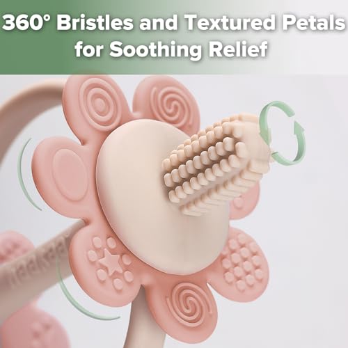 haakaa Silicone Twin Flower Teether,Nipple-Shaped End for Gum Massage,360Β° Baby Toothbrush Head for Self-Brushing Training,Easy to Grip -Soft Pink