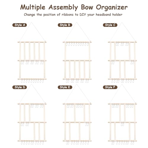 - 【Large Storage Capacity for Hair Accessories】 (Headbands Not Included): ihaness beige 2 rows hair bow organizer for girls with 20 S-shaped plastic hooks can hold up to 40 headbands(each hook holds up to 2 headbands). Plus, headband holder has 8 soft ribbons, holds up to 80pcs small hair bows. Sized at 30.5x15 inches, perfectly organizes all hair accessories while saving drawer space—keeps everything visible, tangle-free, and within reach!, 【Premium Quality Materials & Ideal Size】: Crafted from high-quality cotton canvas and supported by durable pine wood dowels without cracking or deforming, this bow holder for girls hair bows is sturdy, ensures large weight capacity and long-lasting durability. 20 S-shaped plastic hooks is sliding, detachable and safer for baby., 【Space-Saving & Easy to Access】: Declutter your child’s room with this headband organizer bow holder! Simply glance at the hair clip organizer to pick the different styles and colors of headband that perfectly matches your baby’s outfit on busy mornings! You can also adjust the hooks and ribbons of each layer to DIY your own style baby bow holder., 【Pre-Assembled & Easy Installation】: Skip the assembly hassle! The 3 wooden dowels and 8 ribbons of the baby bow organizer are pre-installed already. Just tie the lanyard to both ends of the wooden stick and install the plastic hooks. Comes with 1 invisible nail to hang it over the door, on the wall, or in a closet for nursery or kids room., 【Perfect Gift for Baby/Girls/Women】: This versatile hair accessories organizer isn’t just for baby headbands! Use it to store baby hats, socks, pacifiers, bibs, shoes, display jewelry like necklaces, bracelets, rings for girls or women, and even organize pet bows, ties, collars for dog or cat. A thoughtful gift for baby showers, birthdays, holidays, or any special occasion—bow hanger is the perfect hair accessory organizer for girls to keep everything organized and easy to find!, beige bow holder for baby girl, beige headband holder organizer, beige headband organizer for baby girl, hair clip organizer for girls beige, beige hair accessories organizer for toddler girls