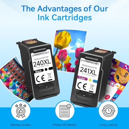 - Product Name: Chromojet PG-240XL/CL-241XL Ink Cartridges Compatible for Canon 240XL 241XL Combo Pack Printer Ink 240 241 PG240XL CL241XL Fit for PIXMA MG3620 MG3600 TS5120 TS5100 MG3220 MG3520 MG2120 MX472 (2 Pack), Printer ink for 240xl 241xl package contents: 2 Pack replacement for canon pg-240xl cl-241xl ink cartridges black/color combo pack(1 240xl black ink cartridge,1 241xl color ink cartridge), High Page Yield: 600 Pages for pg240xl black ink cartridge, 400 Pages for pg241xl color ink cartridge. Based on 5% coverage of A4 paper, our PG-240XL CL-241XL black color combo pack ink cartridges making your printing process more efficient., Wide Compatibility: Compatible for Pixma MG2120/2220/3120/3122/3220/3222/3520/3522/3620/4120/4220 Pixma MX372/392/432/439/452/459/472/479/512/522/532; Pixma TS5120 Printer, Warm Tips: Please carefully check your printer model before placing the order. This item is NOT OEM product