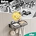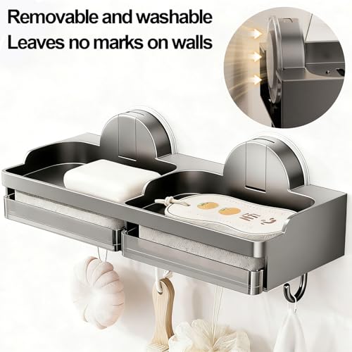- NO-DAMAGE INSTALLATION & DURABLE GRIP : This shower soap holder measures 9.84 inches (25 cm) in length, 3.94 inches (10 cm) in width, 2.95 inches (7.5 cm) in height, and weighs 0.68 lbs (0.31 kg). Install it in seconds with a secure suction cup. No drilling, tools, or glue required. The strong silicone suction delivers reliable stability, while thick, high-quality ABS material stays waterproof and oil-resistant in wet spaces. It removes cleanly and easily without leaving any residue on walls, making it ideal for rental apartments., DOUBLE-LAYER DRAINAGE DESIGN : This top-rated soap dish for shower and one of the best soap dishes for bar soap features two separate compartments to organize multiple soaps efficiently. Its hollow drainage structure paired with a built-in absorbent sponge keeps soaps dry and prevents sogginess. The convenient pull-out water tray traps excess water, eliminating messy spills on countertops., MULTIFUNCTIONAL STORAGE WITH HOOKS : More than a standard bar soap holder, this 2-piece set offers versatile storage for scrub brushes and dish sponges. Built-in hooks add extra hanging space for towels or loofahs, maximizing vertical wall space. It serves perfectly as a shower soap holder and a versatile soap dish for both bathrooms and kitchens., EASY CLEANING WITH PRACTICAL DESIGN : This practical soap tray is designed for low-maintenance use. The pull-out water pan is simple to empty and wipe down, while a built-in squeegee lets you quickly wipe away water stains on countertops. Its open structure allows for easy access and quick cleaning, keeping your space fresh with minimal effort., SLEEK VERSATILE STYLE : This elegant porte savon douche and stylish porte savon combines functional design with modern aesthetics. It serves as a tasteful decor piece for bathrooms and kitchens. It accommodates most standard bar soap sizes and adheres best to smooth surfaces like glass and polished tile.