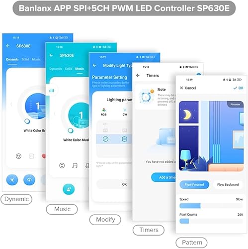 - [Support PWM LED strip] Compatible with PWM LED strips without smart IC chip, including FCOB/COB and SMD 2835/3528/5050/5630/5730. Supports multiple wiring types: 2-Pin (V+ V-) single color/monochrome, 3-Pin CCT (V+ CW WW) tunable white, 4-Pin RGB (V+ R G B), 5-Pin RGBW (V+ R G B W), 6-Pin RGBCCT (V+ R G B CW WW).Note: Monochrome and CCT strips support basic dimming / CCT adjustment only and do not support DIY lighting effects., [Support addressable IC chip LED strip] Supports Addressable IC Chip LED Strip with SPI TTL signal, including 3-Pin (V+ Data GND) and 4-Pin (V+ Data Backup GND) types. Compatible with WS2811 / WS2812B / WS2813 / WS2814 / WS2815 / SK6812 / LB1934 and similar RGB / RGBW / RGBCCT addressable LED strips, including RGBIC COB LED Strip.Not compatible with SK9822 WS2801 etc Data+Clock LED strip.Monochrome and CCT lights do not have the function of DIY lighting effects., [Support SPI+PWM LED Strip] Supports SPI + PWM LED strips at the same time, allowing one controller to run Addressable SPI RGB/RGBIC strips (e.g., WS2811/WS2812B/WS2815) together with PWM non-IC strips such as FCOB/COB single color (2700K/3000K, etc.) or COB CCT tunable. Typical combinations include SPI RGB + 1CH PWM (Monochrome) or SPI RGB + 2CH PWM (CCT).A 12-in-1 LED controller works with multiple LED strip types in one setup to meet different lighting needs., [DIY Custom Lighting Effects + App Control]With the BanlanX App (Bluetooth), you can create DIY custom lighting effects for your LED strip, including customizable colors, dynamic modes, speed, and sensitivity.The app offers 5 control interfaces: dynamic page, static page, music page, custom page and setting page.Timer & Memory Function.Supports up to 5 timers and features power-off memory, which restores your last settings after power is reconnected., [3 control modes] Supports 3 control methods: mobile APP, 2.4G touch remote, and 2.4G touch 86 wall panel. The remote and 86 panel can be set to zone control (up to 4 zones) or unified control (ALL), ideal for multi-area lighting setups.Built-in music lighting effects with 3 music capture methods: phone microphone, player streaming, and built-in high-sensitivity microphone. Note:The APP Grouping function can only be used when all SP630E controllers have exactly the same parameter settings.