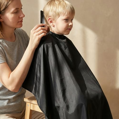 - Complete Hair Cutting Kit: This all-in-one set provides essential barber supplies for home or salon use, including 1 professional black cape, 1 double-headed comb, and 2 clips to help section hair while styling, Premium Waterproof Quality: Crafted from high quality polyester taffeta, this hairdressing gown offers excellent water resistance and anti-static properties, ensuring cut hair shakes off easily without sticking to the fabric or clothes, Adjustable for All Ages: Designed with a flexible neckline and durable snap closure, this hair cutting cape fits comfortably around the neck of varying sizes, making it perfect for men, women, and kids during any haircut session, Large Coverage and Protection: Measuring 140 cm by 120 cm, the large salon apron provides full coverage to shield clothing from dyes, water, and shampoo, keeping your clients clean and dry during coloring or beard trimming, Easy Care and Maintenance: The smooth fabric is reusable and simple to maintain, allowing you to wipe it clean with a damp cloth or machine wash it, making it a hygienic and quick drying choice for busy hairdressers
