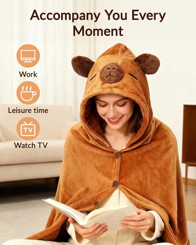 - Adorable Capybara Design: This wearable hooded blanket features a silly and funny capybara with fun gloves and realistic details, making it a must-have for capybara lovers! Perfect as capybara gifts for teen girls or boys, and adults who enjoy this cute style., Soft & Warm: Made with fuzzy plush material, this practical capybara blanket is incredibly soft, cozy, and ideal for staying warm during fall and winter. Use it for lounging around the house, movie nights, or as a special capybara onesie alternative., One Size Fits Most: Measuring 150cm x 130cm (59inch x 51inch), this wearable blanket fits most teenagers, women, and men. It’s a perfect capybara costume for adults or teens, whether for relaxing at home or outdoor fun like camping., Perfect Gift for Any Occasion: An unforgettable gift idea for birthdays, Christmas, Valentine’s Day, anniversaries, mothers day or valentines day! Great as capybara gifts for her, him, daughter, granddaughter, wife, girlfriend, niece, friends, daughters, sons, or college students—surprise them with this adorable capybara stuff., Functional & Fun Design: Upgraded with buttons on the arms to prevent slipping, this capybara hoodie blanket keeps you hands-free while reading, relaxing, or exploring outdoors. It’s more than a blanket—it’s a playful capybara “friends”!