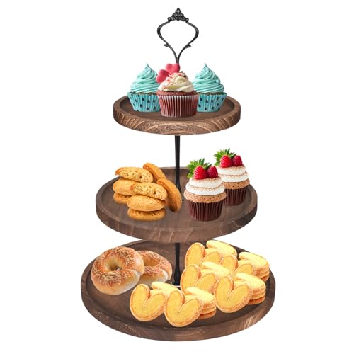 - Vintage Sturdy Construction – Crafted from premium paulownia wood and durable metal, this 3-tier cupcake stand is safe, crack-resistant, and built to last for years of use. Each solid wood tray features raised edges to prevent desserts from sliding off, ensuring reliable display and serving., Ideal Tiered Dimensions – Designed with practical sizing: bottom plate (25 cm), middle plate (20 cm), top plate (15 cm). The assembled height reaches 36 cm with 10 cm spacing between each tier, offering ample space to showcase various treats without overcrowding., Tool-Free Easy Assembly & Storage – Finely polished with a smooth, burr-free surface, this dessert stand assembles in minutes with just a screwdriver (screws pre-embedded). It disassembles effortlessly for compact storage in a box, saving counter and cabinet space when not in use., Elegant Natural Wood Aesthetics – The beautiful acacia wood texture and classic coffee brown finish add a rustic-vintage charm to any event. The top metal handle doubles as a stylish crown decoration, making it a eye-catching centerpiece for your dessert table., Versatile for All Occasions – Perfect for displaying cupcakes, cookies, pastries, candies, doughnuts, cheese, and snacks. Ideal for weddings, birthdays, baby showers, afternoon tea parties, Halloween, Thanksgiving, Christmas, and daily home or office use.