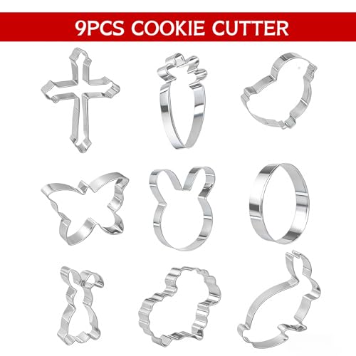 - Package: you will get 9pcs Easter cookie cutters in 9 different shapes, enough to meet your needs for Easter party, Material: The cookie cutters are made of quality stainless steel, sturdy and not easy to break, reusable and can be used for many times, Easter Designs: These Easter cookie cutters features 9 different designs, including Easter egg, bunny, chick, butterfly, carrot, sheep and so on. Full of Easter atmosphere,creat more festive atmosphere to your home, Easy to use: The tool surface is smooth and leaves no residue when demolding. Easy to clean, can be washed in the dishwasher, Wide Application:The Easter Cookie Cutters are suitable for Easter, Christmas, birthday, engagement, graduation and so on. They can be used for cookies, biscuits, pancake, chocolates and more, and share with your family and friends