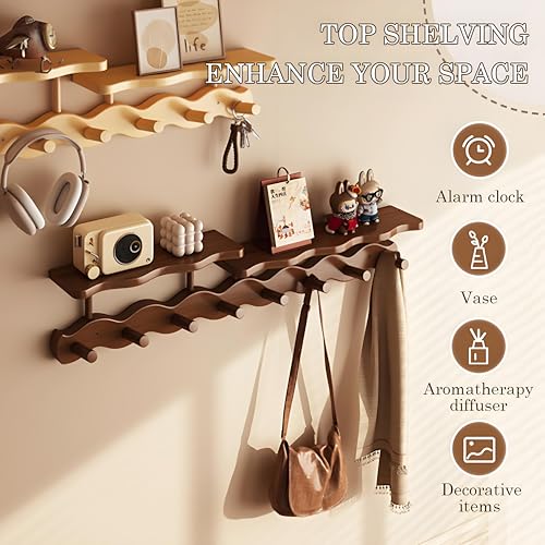 - 【Durable Materials】Select premium timber undergoes thickening and fine sanding for robust durability and a smooth, burr-free surface with a comfortable feel, its sturdy, reliable design accommodates heavy hanging items., 【2-in-1 Design】This multifunctional coat rack combines hooks with a storage shelf. The top shelf accommodates potted plants, clocks or aromatherapy items, while the 8 hooks below conveniently store coats, bags, umbrellas and other items for easy access., 【Space Saving】This wall-mounted hook rack measures 72 x 16 x 10cm, maximizing vertical space to prevent clutter accumulation while keeping daily essentials within easy reach. Ideal for living rooms, compact flats, or hallways., 【Widely Use】Beyond serving as a coat rack for hallways, corridors, and bedrooms, this floating storage rack can also be used in bathrooms to store bathrobes, towels, and toiletries; or in kitchens to hang dishcloths, cups, or air-dry utensils., 【Two Install】Equipped with installation tools, offering two mounting options: screws for permanent stability and maximum load capacity; or adhesive for tool-free, wall-friendly, flexible and convenient installation.