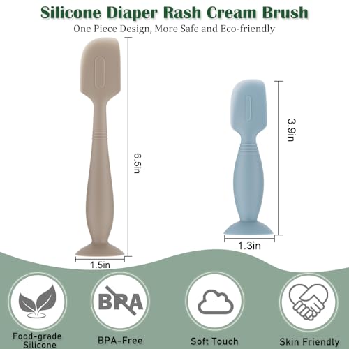 - 【Package Content】:2in1 value pack include 1*large size and 1*mini size diaper cream applicators, compact size design:Large applicator measures 6.5x1.57 inches- enough to easily reach the bottom of the diaper cream jar. small applicator measures 4x1.38 inches- easily added to a diaper bag for on-the-go use., 【Gentle&Safe Material】: Our diaper spatula is made of high-quality silicone material, which is soft&flexible,BPA-Free,Toxin-free, and Dishwasher and Freezer Safe.It is safe and gentle for baby's sensitive skin, so you don't have to worry about scratching your baby's skin when applying ointment with it., 【Suction Cup Base Design】: The Diaper Cream Applicator bottom is designed with a suction base make it easily placed on the table during use.When your baby is crying or dressing your baby,you can free your hands and attach the applicator to the table without worrying about the paste on the applicator staining the clothes., 【Faster&Easier Application】:The spatula heads are soft and flexible,easy to apply cream/ointment to the skin and spread it around evenly and keep your hands clean.Using this diaper cream applicator,you can avoid direct contact with the butt cream and baby's skin with your hands,which is safer for the baby and saves you the trouble of getting your hands stained with cream., 【Easy to Clean】:Diaper cream spatula has smooth surface, after using, simply scoop a generous amount of butt paste diaper cream onto the diaper rash cream applicator, or you can also directly wipe off the butt paste spatula with a cloth and then clean it with water later, dishwasher,steam steriliztion and boiling water safe.