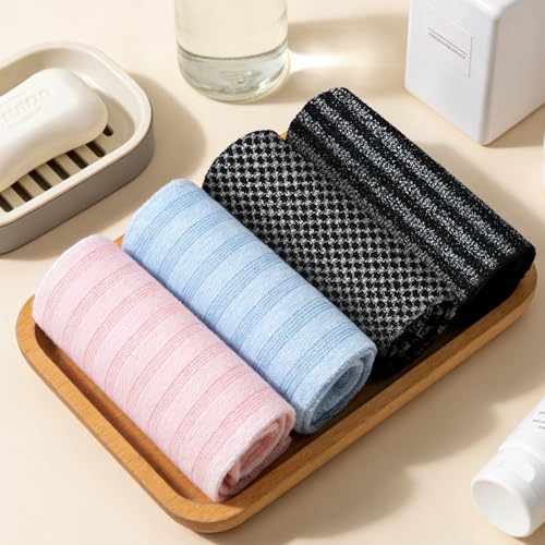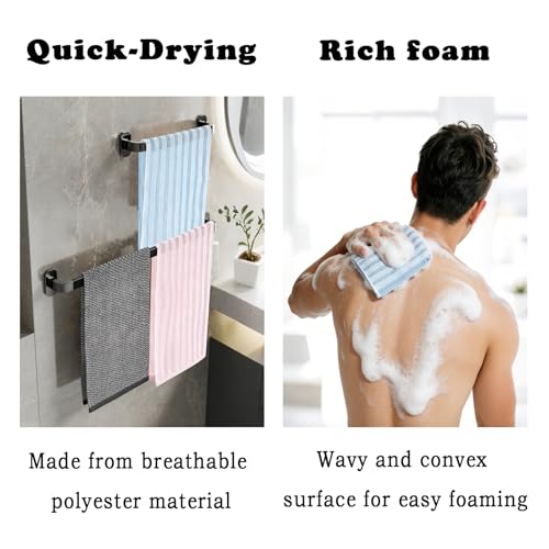 - Deep Exfoliation: Our exfoliating towel gently removes dead skin cells, dirt, and oil. Ideal for achieving a deeper clean and revitalizing your skincare routine, Full Back Coverage: Measuring 100 x 25 cm, this long shower towel easily reaches your entire back and other hard-to-wash areas, providing satisfying clean without assistance, Easy to Use: Pour a little body wash on the exfoliating cloth and rub; When the towel is frothy, rub it on your body, it is enough to clean and exfoliate, Quick-Dry: Made from breathable polyester material, this exfoliating cloth dries quickly after use, stays hygienic, and is lightweight—perfect for home, gym, or travel, 4PCS Set: You receive four exfoliating shower towels - striped pink, blue, black, and black grid— making it a practical set for personal use or sharing
