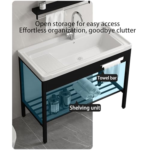 - [Multi-Function Laundry Tub Set] Crafted from high-quality ceramic for exceptional durability and long-lasting performance. Features a swivel faucet with hot/cold water connections, overflow drain, and drainage assembly for effortless installation. Spacious storage compartment conveniently holds tools and daily essentials. Reinforced stainless steel frame offers rust resistance and superior weight-bearing capacity., [Practical Features] The textured washboard effectively removes stubborn stains, helping you clean clothes quickly. The heavy-duty rack with storage shelves and towel bar fits perfectly with the laundry tub, keeping your laundry room tidy and organized. Adjustable legs accommodate uneven floors., [Premium Materials] Triple-layer SmartClean glaze technology delivers a smooth, stain-resistant finish that resists yellowing. The surface coating simplifies cleaning while enhancing scratch resistance. Built to endure rigorous daily use., [Versatile Application] This freestanding laundry sink features a pristine white finish that complements any space. Beyond laundry duties, it doubles as a handwashing station for enhanced utility. Ideal for home bathrooms, hotel utility areas, garages, commercial restrooms, and various indoor/outdoor settings., [Professional After-Sales Support] For product inquiries or requests for alternative styles/sizes, our dedicated team provides expert assistance to ensure a worry-free, satisfying purchasing experience.
