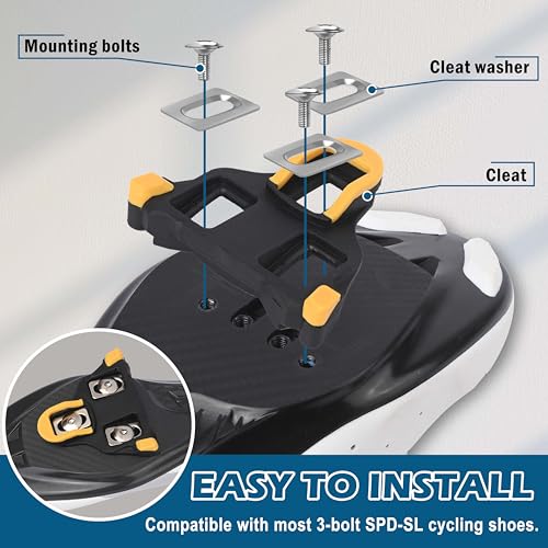 - The Smart Value Pack: Get ahead of wear and tear without breaking the bank. This value pack of four SPD SL cleats offers significant savings and includes a full set plus spares. Each cleats delivers professional-grade performance, perfectly compatible with SPD-SL road bike pedals (including RS550, 105, Ultegra, Dura-Ace, Tiagra)., Experience Easy Engagement & Release: Designed for every riding moment, this spd-sl cleats delivers a smooth clip-in and a clean, reliable twist-out when you need it. It’s the confidence you need for city traffic or technical trails, right under your foot., Optimized 6-Degree Float: 6 degrees of float gives your knees the natural movement they need for comfort on long rides, without sacrificing a locked-in feel for power transfer. It’s the optimal balance of freedom and control., Built for Mile After Mile: Don’t let wear slow you down. Every bike cleat in this pack is molded from a tough polyamide and TPU composite, engineered to resist deformation and outlast standard plastics for consistent, reliable performance season after season., Complete Ready-to-Install Kits: Each of the four cleats comes with its own set of mounting hardware (12 screws & 12 washers & 2 wrench), providing everything you need for multiple installations. Easily fit them to any standard 3-hole road or spin shoe and get back to riding in minutes.