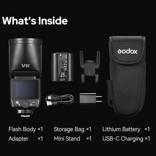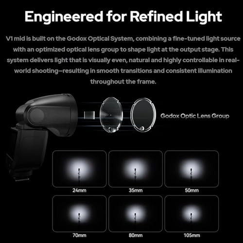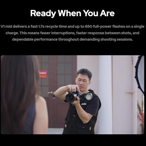 - 【Effective Power Supply】 7.2V/2200mAh high-capacity lithium battery provides approx.650 flashes and up to 1.7s recycle time at full power and full battery level. This means fewer interruptions, faster response between shots, and dependable performance throughout demanding shooting sessions., 【LED Modeling Lamp & Wireless Control Ability】Built-in LED modeling lamp with adjustable brightness (1-10) to preview light effects. Built-in Godox 2.4G wireless X system extends more shooting possibilities. Round flash head provides even and soft light effects., 【Professional Flash Modes and Sync】The V1 mid offers comprehensive lighting control with support for TTL, Manual, and Multi modes, along with High-Speed Sync and first- and rear-curtain synchronization, allowing photographers to adapt quickly to changing light conditions and execute creative ideas with precision and confidence., 【Intuitive Touch Control】The touchscreen interface features a clean, intuitive UI for fast and effortless adjustments. Whether making quick changes on the move or fine-tuning creative settings, controls remain clear, responsive, and easy to navigate., 【USB Type-C Charging】V1 mid’s battery supports USB Type-C charging, offering flexible power options on set or on the go. Charge via power bank or standard adapters to stay ready wherever your shoot takes you., 【Engineered for Refined Light】V1 mid is built on the Godox Optical System, combining a fine-tuned light source with an optimized optical lens group(SOLD SEPERATELY) to shape light at the output stage. This system delivers light that is visually even, natural and highly controllable in real-world shooting—resulting in smooth transitions and consistent illumination throughout the frame.