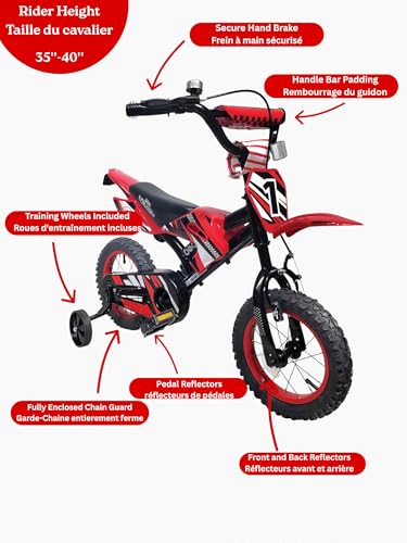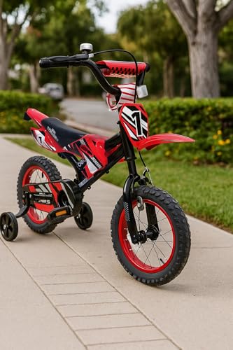 - XTREME MOTOR BIKE THEMED- Motocross themed bike with trainging wheels brings the thrill of a motorbike/motocross to young riders aged 2-4, EASY RIDE FOR KIDS WITH TRAINING WHEELS - Features removable training wheels that assist beginners, making it effortless for young children to balance and build confidence as they learn to pedal., COMFORTABLE ADJUSTABLE SEAT - Equipped with a cushioned, adjustable seat that grows with your child, ensuring a comfortable fit for ages 2 to 5 or 35"-40", EASY TO MANEUVER DESIGN - Lightweight construction with smooth wheels allows for hassle-free steering and control, perfect for young girls and boys developing their coordination skills on toddler bikes with training wheels., STURDY AND SAFE - Crafted with durable, high-quality steel, a secure hand brake, chain guard, plastic pedal reflectors and bell included to ensure a stable and secure ride for toddlers ages 2 to 5, providing long-lasting use and safety during every adventure.