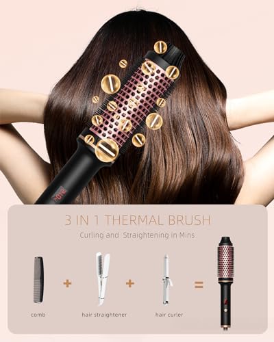 - 【Double PTC Instant Heating】The thermal brush has 10 variable heating options, and the temperature can be control between 120℃/248°F - 210℃/410°F, which is suitable for long, short, straight, curly, thick or thin hair.You’ll also love the extra-fast 30-second heat-up because PTC technology. You can choose the right temperature according to different hair types to create dreamy hairstyles, which can be used as wig straighteners, Hair combs, Hair straighteners, and Hair curlers., 【Curling Iron Brush Volumizing Brush 】1.5 inch ionic heated brush root volumizer creates root volume & loose curls with a professional ionic tourmaline ceramic barrel of thermal brush that eliminates static and tame frizz, leaving your hair looking healthy and shiny. The ceramic barrel of the curling iron brush ensures even heat distribution for silky smooth hair. The dual voltage 3/4 inch hot curling brush is only 170g and 8.7 inch length, it’s ideal for travel. NOTE: IT IS NOT A HOT AIR BRUSH!!, 【Ceramic Tourmaline Ionic Technology 4X Less Damage & Frizz】The heated round brush with ceramic tourmaline barrel emits direct negative ion penetrating the hair quickly to help lock in moisture, nourish damaged hair and split ends, reducing frizz, static and kinks to make hair smoother and shinier. With our Tourmaline heated brush for healthy hair, leaving your hair looking healthy and shiny., 【Two Kinds of Comb Teeth of Hot Styling Brush】The cold broad comb teeth and tangle-free bristles make it easier to grab and gently glide through the hair, preventing tangling and providing more convenience while styling your hair. The heated hair brush compared with normal brush curling irons, this curling brush has anti-scald nylon bristles and long anti-tip to prevent burned skin. High quality bristles grip your hair well and keep enough time for styling., 【Electric Hair Brush Multiple Functions】The LCD digital display of thermal hair brush has multiple temperature settings from 120℃/248°F up to 210℃/410°F to meet all hair types' styling needs.This hot brush styler curling brush has a 60-minute auto shut-off for safety, a 360° swivel cord for easy use and 100-240V dual voltage for travel convenience. If any questions, please contact us anytime, we are always at your service.
