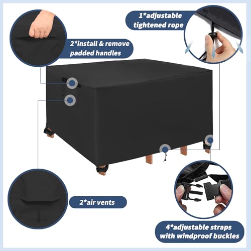 - 【600D WATERPROOF & UV RESISTANT MATERIAL】KALINCO patio furniture covers waterproof is made of durable 600D oxford fabric, have waterproof and UV-resistance properties. With PU 3000mm waterproof coating, all seams are covered with waterproof sealing tape. Mixed with upgraded Anti-UV composite, prevents the patio table and chair cover from ageing, disintegration and tearing., 【ADJUSTABLE WINDPROOF STRAPS】Our waterproof outdoor furniture covers have 4 adjustable straps with windproof buckles. Integrated buckle system design, help lock your furniture tightly and protect outdoor table and chair set covers from blowing off in the high wind. Upgraded buckles provides easy installation and quick release., 【AIR VENT DESIGN】This outdoor table and chair set covers have air vent design at two sides stay open, helps air circulation to reduce the condensation on your furniture and keep the patio furniture dry. Two soft handles make it easy to install and remove., 【FULL PROTECTION PATIO FURNITURE COVERS】The integrated elastic cord sewn around the hem of the patio furniture covers, you can adjust the tightness of the hem straps according to the size or shape of your Furniture. All the seam has waterproof sealing tape inside to prevent water to leak into the Furniture, provide full protection for your table and chair., 【WIDELY USE & CONVENIENT STORAGE】Our patio furniture cover waterproof is suitable for most shapes, such as dining table and chair set, rattan sectional furniture, coffee table, sofa etc. A free storage bag is included, which saves space. Please measure your furniture size before buying.