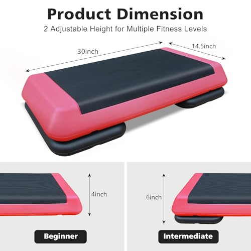 - Sturdy Step Platforms: The tall aerobic step platform features eco-friendly, constructed with ABS texture surface which is reinforced by multiple plates and bars making it sturdy, stable and compact for long-lasting use. The large and heavy duty platform holds its maximum weight limit of 550 pounds, so you can take every step in confidence, 【Adjustable Heights】The stepping platform for exercise consists of a non-slip platform with support blocks that can adjust the height from 4 to 6 inches depending on the intensity of the workout. The exercise stepper is a widely used aerobic fitness system, perfect for beginners,rehabilitation training patients and advanced athletes looking to work out at home., 【Non-slip Design】The textured surface is non-slip and shock-absorbing, which means you can stay stable through each set of steps. Each riser is also fitted with a non-slip rubber foot to prevent it from sliding when moving and scraping the floor., 【Versatile Use】In addition to step routines, this step benches can also be used for weight training, core strengthening, and more. It can be used to target your hamstrings with alternating lunges and also help you to strengthen your chest and back's muscles by pushups. Great for Jump Step-Ups, Offset-Pushup Crossover, Squat-Pop Over, Decline Mountain Climber, & more.It is suitable for all ages and fitness levels., 【Easy to Carry and Store】: 30 " long x 13.8 " wide x 6 " high, easy to carry to the gym or office fitness class. Stack the risers under the platform for easy storage. Ideal for exercise classes, recovering from an injury or a regular workout routine., 【After-Sales 】If you have any problem, you can contact the our support team at any time. We offer 24/7 professional customer support, will solve any problem in time and provide satisfying solutions if there are any problems!