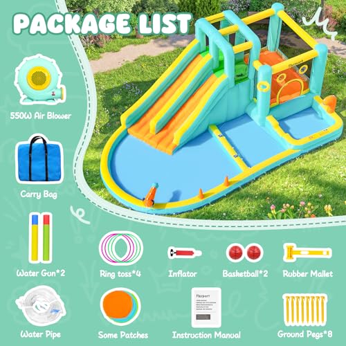 - 【8-in-1 Experience Endless Playfulness】 Our inflatable bounce castle combines with 2 long slide, deep pool, 2 water cannon, 2 sprinker, basketball shooting, huge splash pool, bounce area, climbling wall, and 6 soft water balls shoot each other. The kids pool inflatable can be filled with water, ocean ball or sand, which is adding much fun to play. And Just connect the hose and it can be used as a water park. Make the party more shining than ever, 【Easy to Assemble & Storage】The inflatable waterslide bouncer comes with a 680W air blower, set-up and take down is easily done in under a few minutes. This jumping castle is portable and perfect for the park, garage, backyard, etc. They will love to play with their friends and become more outgoing, 【Distinctive Material & Safe for Kids】 Made of high quality 420D Oxford + 840D PVC fabric, 50% extra thick for jumping and sliding areas. The jumping area is surrounded by 3 sides of mesh safety netting to protect your children from falling while jumping, and the mesh netting design provides maximum ventilation. Kids are desire to have one the inflatable bouncer and have fun with their little partner, 【Best Gift Idea for Playing Party】The bouncy house with blower is a perfect present for kids as birthday gift, Thanksgiving gift, Christmas gifts and etc. A great gift for your children any time of the year wherever indoor or outdoor, it can be used for wet slide during hot summer and dry slide at winter time, 【Spacious for Group Fun】Designed for 5-8 players at once, this bouncy castle ensures everyone joins the fun. For optimal safety and durability, we recommend a maximum weight limit of 100 pounds per child, with a total capacity of 440 pounds